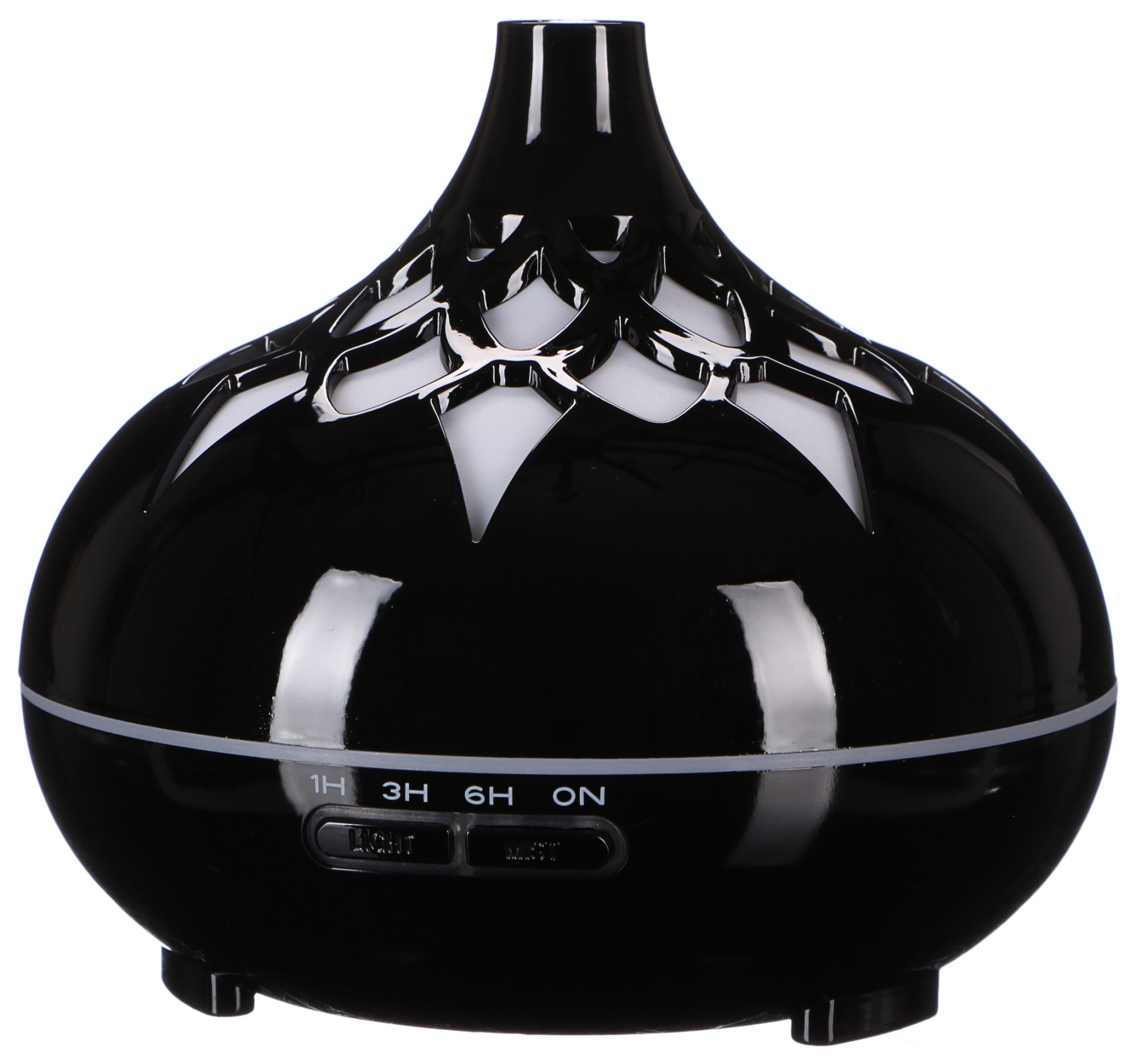 - Premere il pulsante "MIST" per impostare il tempo di funzionamento (1H, 3H, 6H, funzionamento continuo). Tenere premuto il pulsante "MIST" più a lungo per regolare l'intensità del vapore. Di default, quando il diffusore è acceso, è impostata l'intensità inferiore.