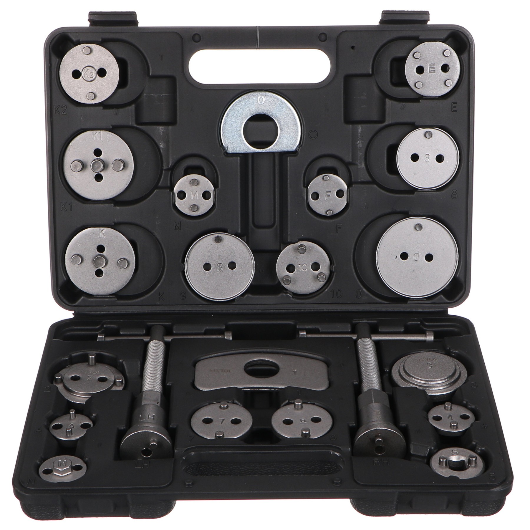 Il set universale di compressori per pistoni dei freni BRAKE SET BLACK include 22 pezzi in una custodia di plastica nera, ideale per l'installazione e la retrazione dei pistoni e delle pinze dei freni a disco. Il set include viti di compressione con filettatura destrorsa e sinistrorsa con magneti, due piastre di arresto e 18 adattatori differenti. Nei veicoli con sistemi di freno a mano integrati nelle pinze, i pistoni vengono retratti tramite rotazione inversa, mentre in altri veicoli i pistoni vengono spinti indietro.